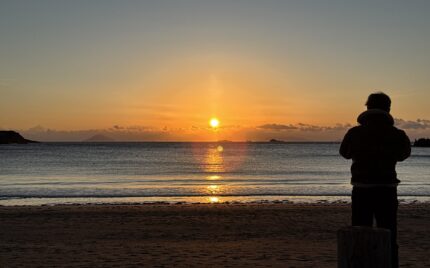 05月01日 早朝の南伊豆弓ヶ浜海岸 ひんやりとした朝の空気が気持ち良いね、満月が西の空に隠れるところでした、湾内外ベタ凪だよGW中日ですがパーキングは東西共にがらがら人の出もパラパラですよ、雲が全くなく快晴・無風、サンロードの輝きもいつもより眩しいかも、この後もキッラッキッラでピッカッピッカな一日ですよ。