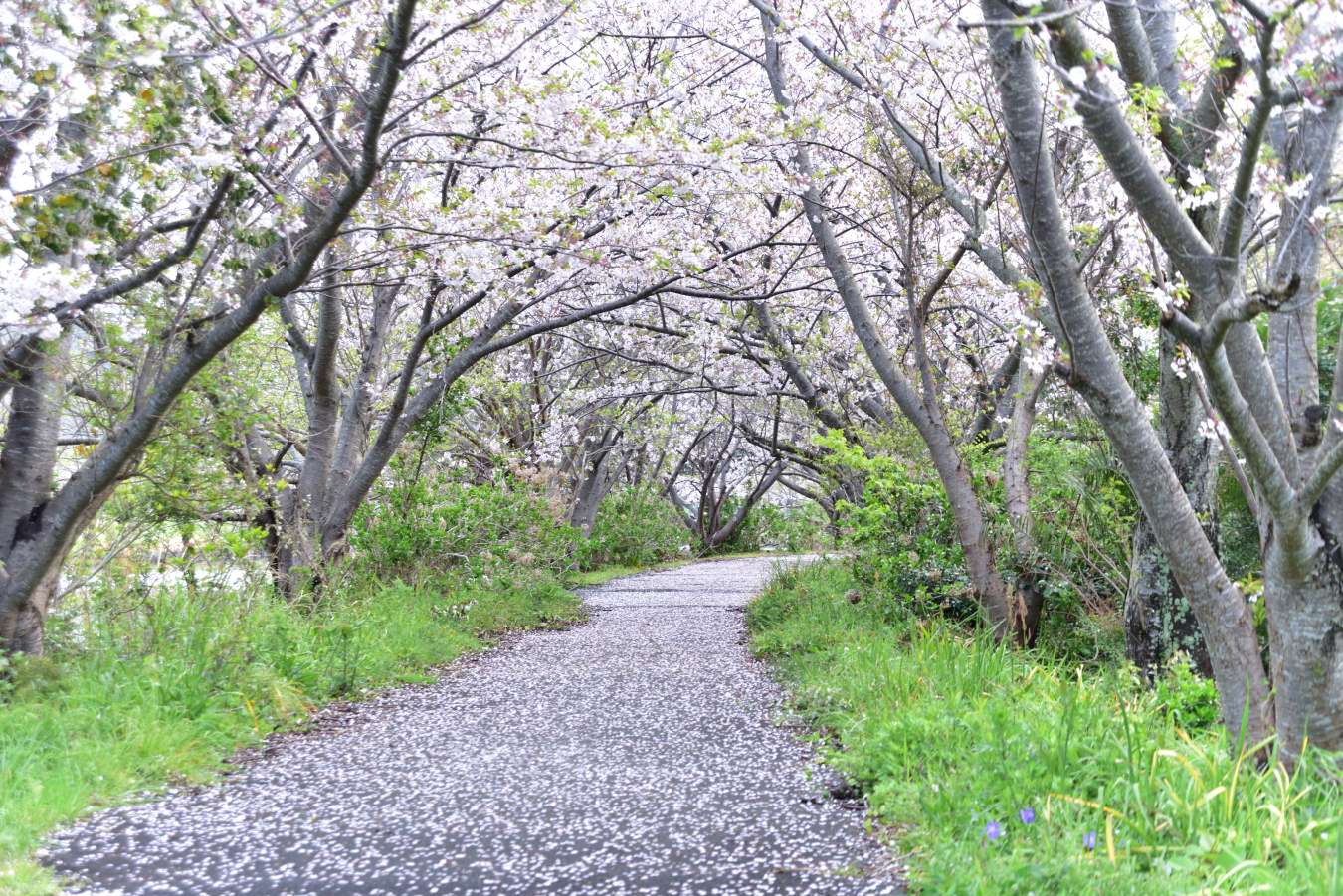 青野川堤防・桜の花トンネルの下に桜の花絨毯がうっすらと出来ました、一昨日大風が吹いたので少し散ったのね、
